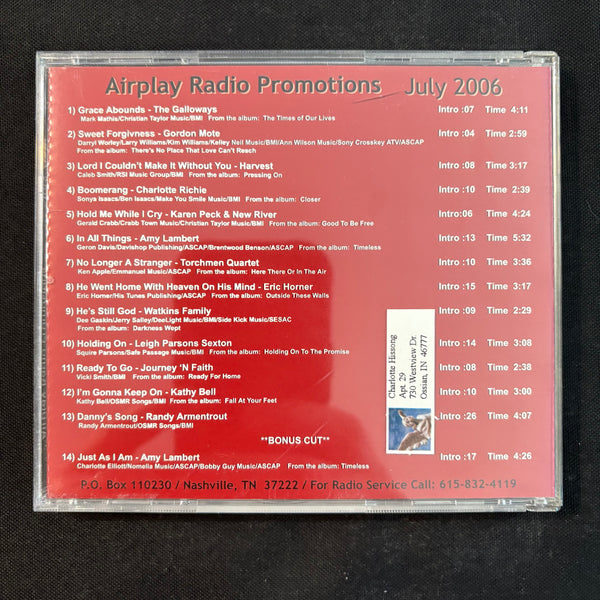 14 cuts of Christian and gospel music for radio airplay on this promotional industry sampler. Tracks from: The Galloways, Gordon Mote, Harvest, Charlotte Richie, Karen Peck and New River, Amy Lambert, Torchmen Quartet, Eric Horner, Watkins Family, Leigh Parsons Sexton, Journey 'n Faith, Kathy Bell, and Randy Armentrout, plus a second bonus cut from Amy Lambert.