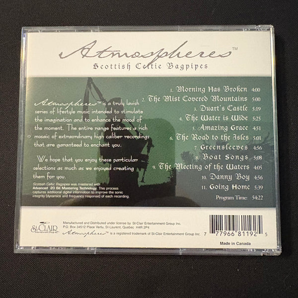 ARTIST: n/a TITLE: Atmospheres: Scottish Celtic Bagpipes LABEL: St. Clair YEAR: not listed FORMAT: CD CONDITION: used, in very good condition, comes in jewel case with all inserts