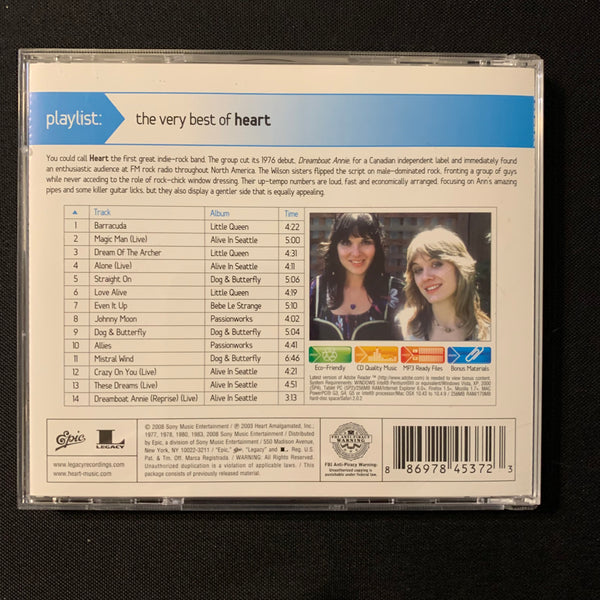 ARTIST: Heart TITLE: Playlist: The Best of Heart LABEL: Legacy/Epic YEAR: 2008 FORMAT: CD CONDITION: used, in very good condition, comes in jewel case with all inserts