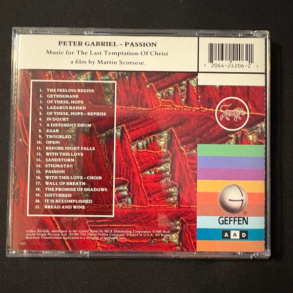 ARTIST: Peter Gabriel TITLE: Passion: Music For the Last Temptation of Christ LABEL: Geffen YEAR: 1989 FORMAT: CD CONDITION: used, in very good condition, comes in jewel case with all inserts