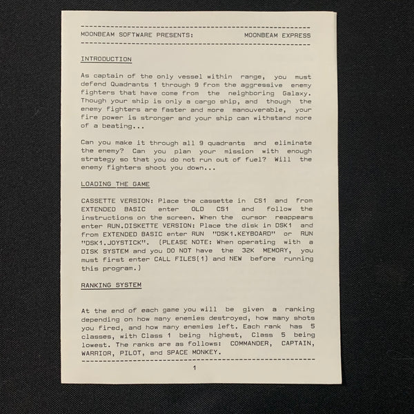 Boxed and complete with instructions. Box shows typical age-related wear and speckling. "Moonbeam Express" is one of the more ambitious titles from this early third-party software company. Consult your onboard nav computer, travel to different sectors of the galaxy and eliminate the baddies, but watch your fuel and damages!